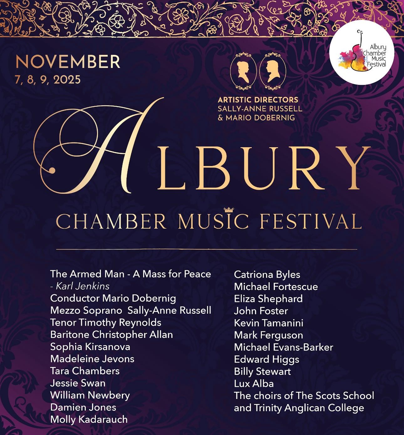 The Armed Man – A Mass For Peace, was a powerful and emotionally stirring work boldly chosen to open the 2025 Albury Chamber Music Festival. Composed as a modern mass in 1999 by Karl Jenkins, it is well known for its reflections on the war-torn 20th century. Dedicated to war victims, it is powerful work offering gentle hope. While many performances add projections of confronting war images, the intense score says it all, although some find it can be repetitive at times with overpowering relentlessness – as war is.