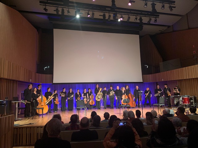 The number of performers involved in each item had increased as the concert progressed. For the final item, Enter the impossible, by the composer, drummer, and scholar Jessie Cox, the Conservatorium’s fifteen-strong New Music Ensemble joined Contrechamps. Those with the largest instruments were lined up across the stage, backs to the audience, while the rest – with instruments but no music – spread out along the side aisles.
