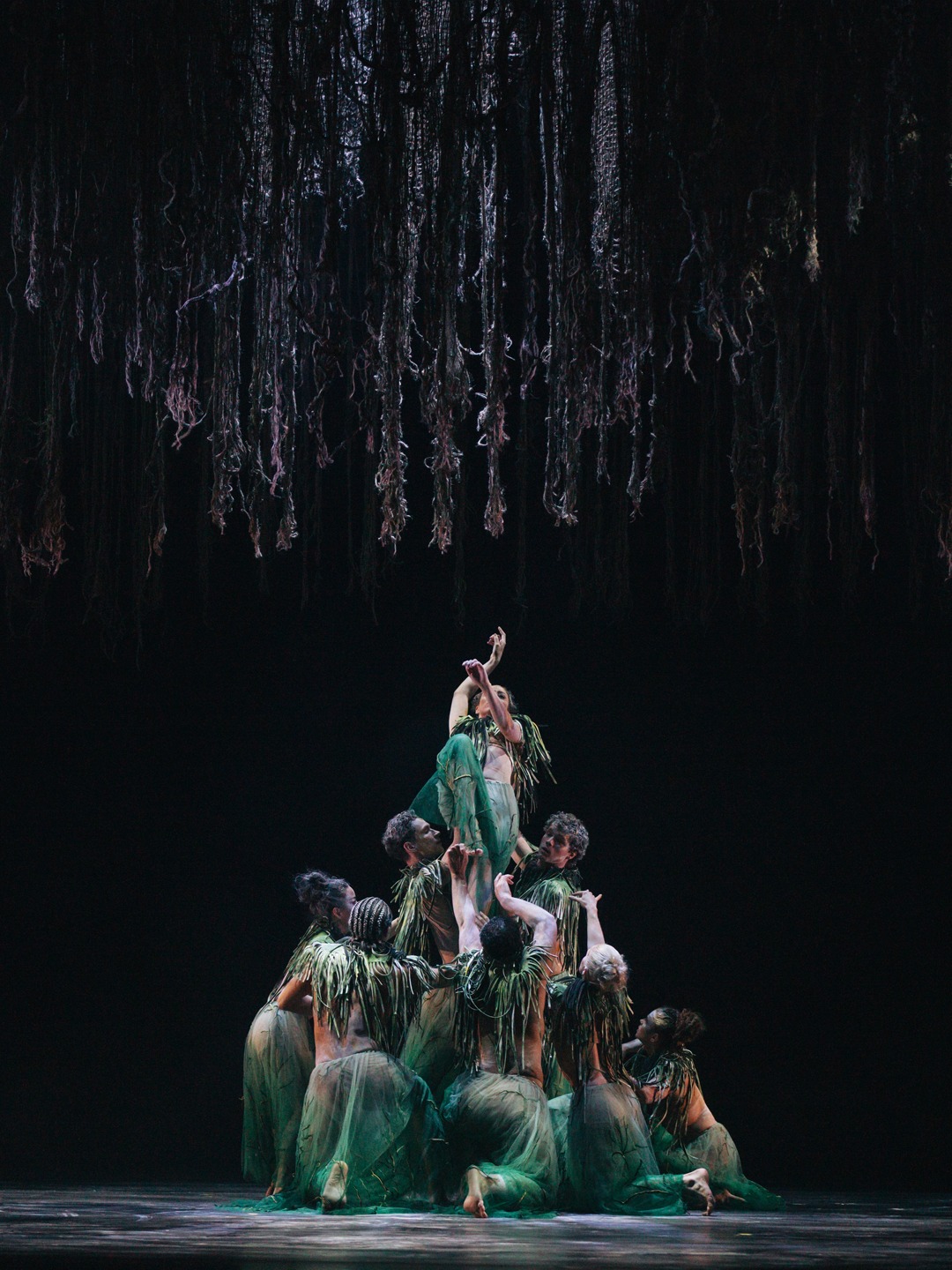 The ballet opens with an ensemble of women clearing the ground with their sticks, tapping the earth with a sense of purpose and poise. The setting is dark and misty with much filtered light against costumes of muted rust color. The scene progresses to one of the most memorable and creative sections in Flora: “Sleeping Yams”. A set piece resembling an intricate root system is lowered from the rafters suspending five dancers in aerial apparatuses. The dancers are clumped together in a way that makes it difficult to identify them as human. They begin to pulse and quiver in midair slowly revealing themselves as individuals. The metamorphosis is magical and eventually progresses to a single dancer. Callum Linnane performs an impressive solo grounded in intricate floor work exhibiting great control and strength. His ability to integrate classical technique with earthy pith while dancing to one of the more synthesized sections of the score is mesmerising.