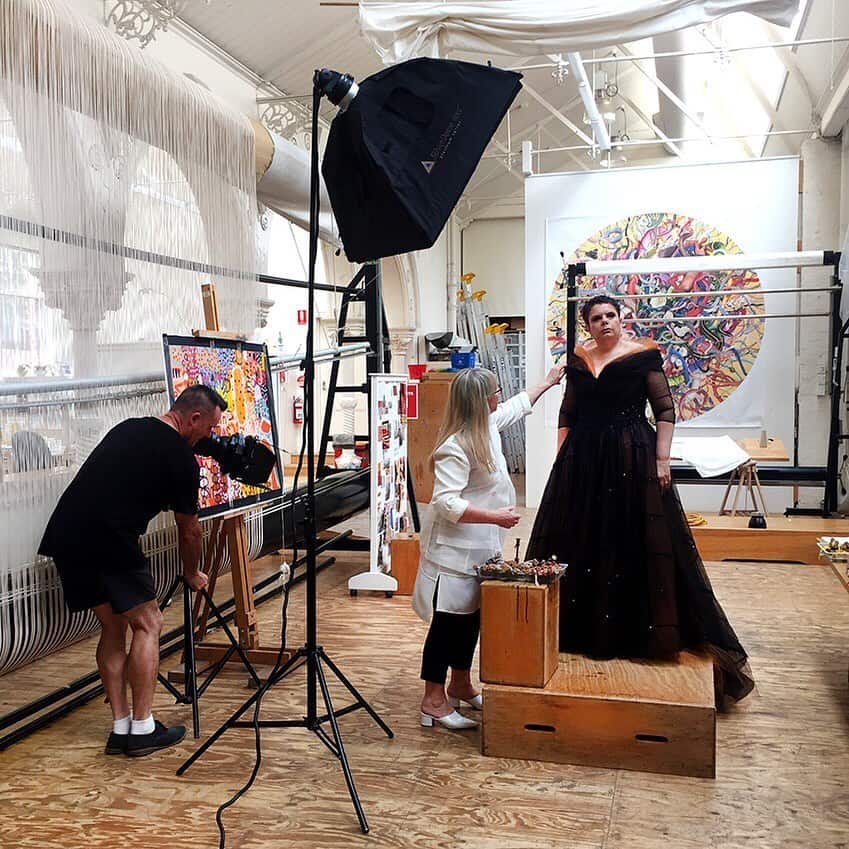 Friday afternoon traffic and inclement weather might have caused some VIPs to arrive late, but it didn’t put a dampener on the Australian launch of Deborah Cheetham’s Woven Song. Part of Asia TOPA, it also involved further collaborations between the Australian Tapestry Workshop (ATW), Short Black Opera and one of Australia’s leading couturiers, Linda Britten. Comprising the first three songs of what was planned as a song cycle of nine, each with an approximate duration of nine minutes, the performance was held in the workroom of the ATW, against a backdrop of an unexpected tenth tapestry destined for the Australian Embassy in Jakarta. The setting could not have been more appropriate.